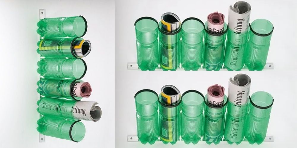 Love your number one magazines yet disdain the messiness they make? Slice up old plastic containers to make these useful paper and magazine coordinators. All you need are scissors, paint, tape, and a way of mounting them, and your home will be greener and more coordinated.